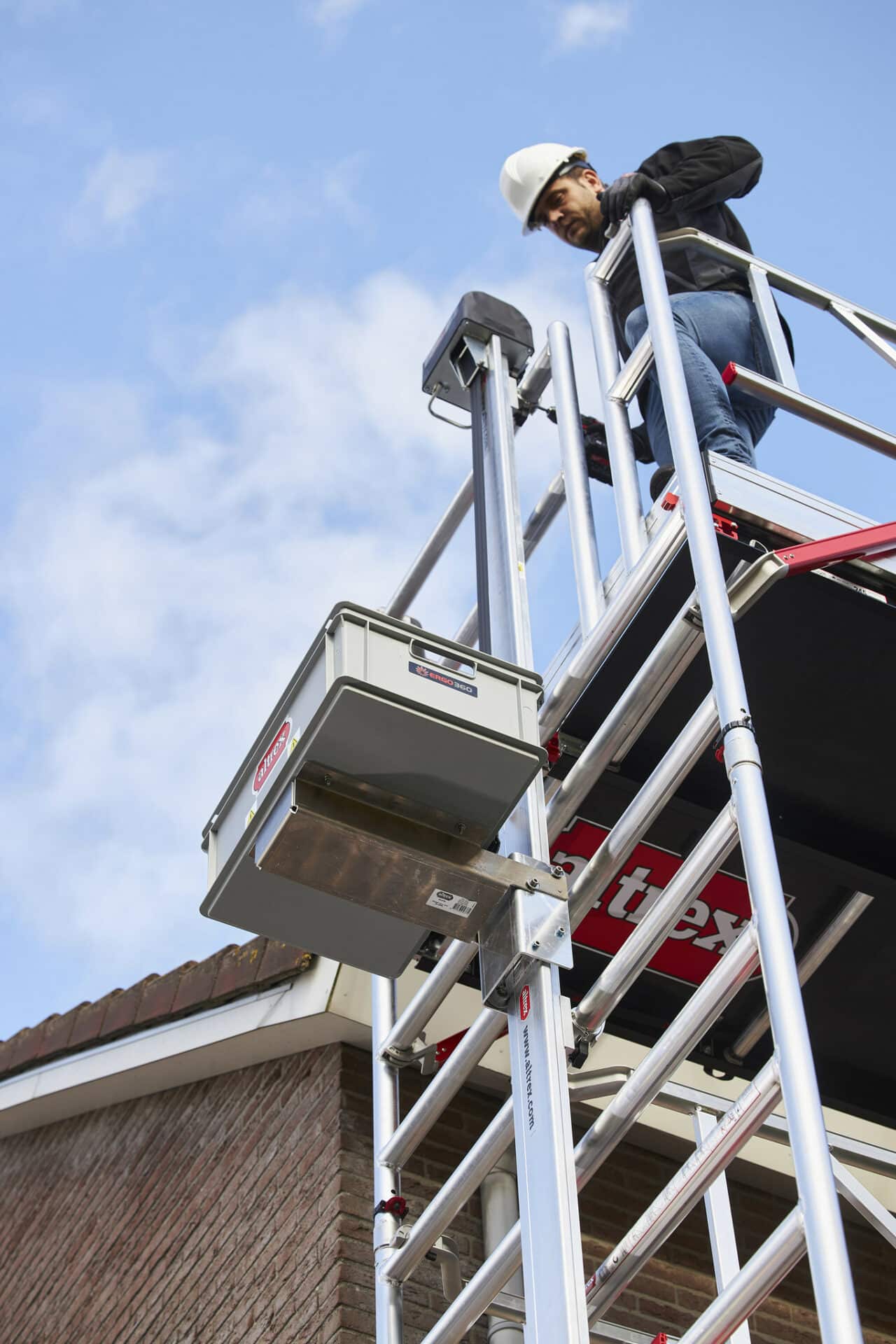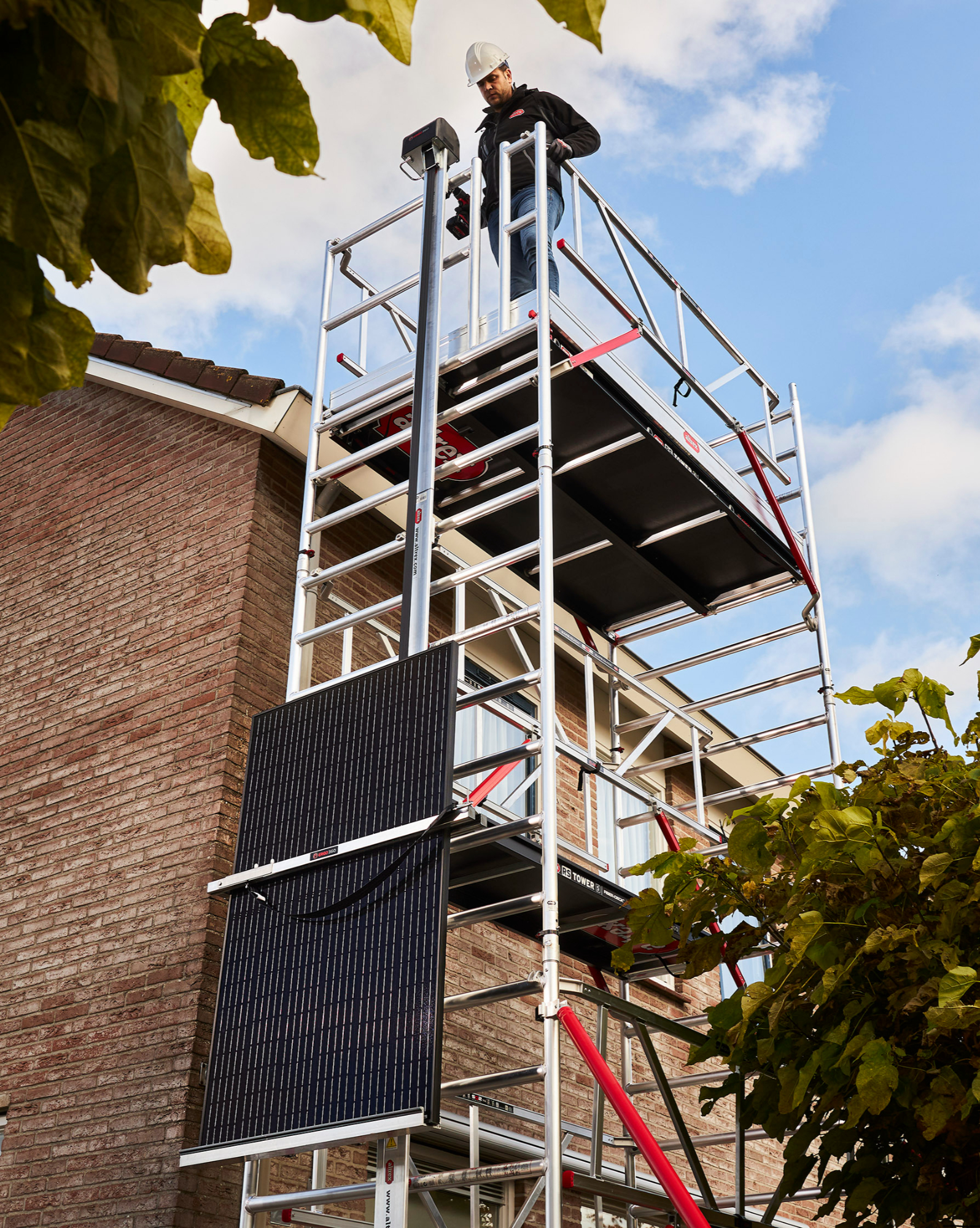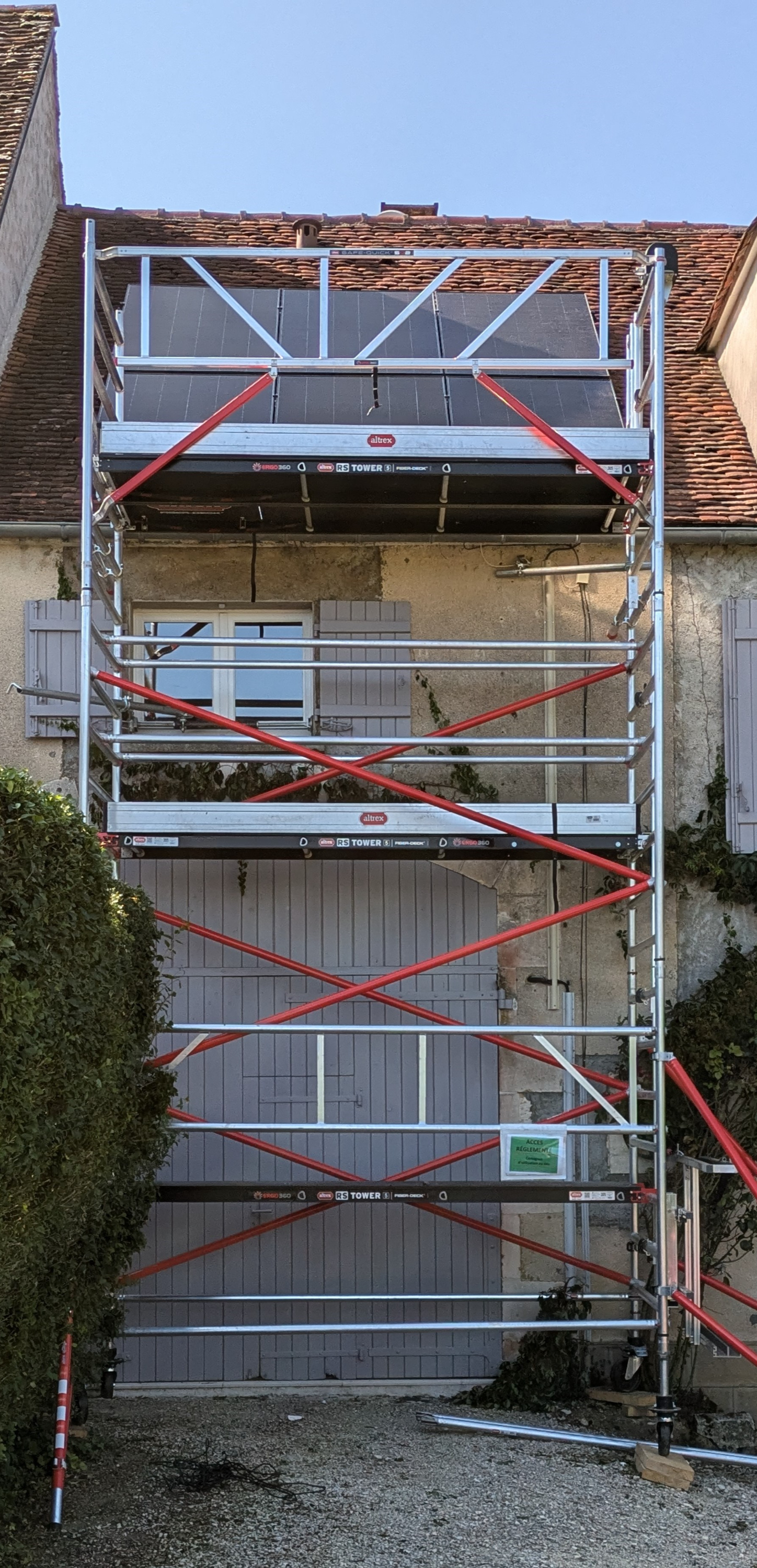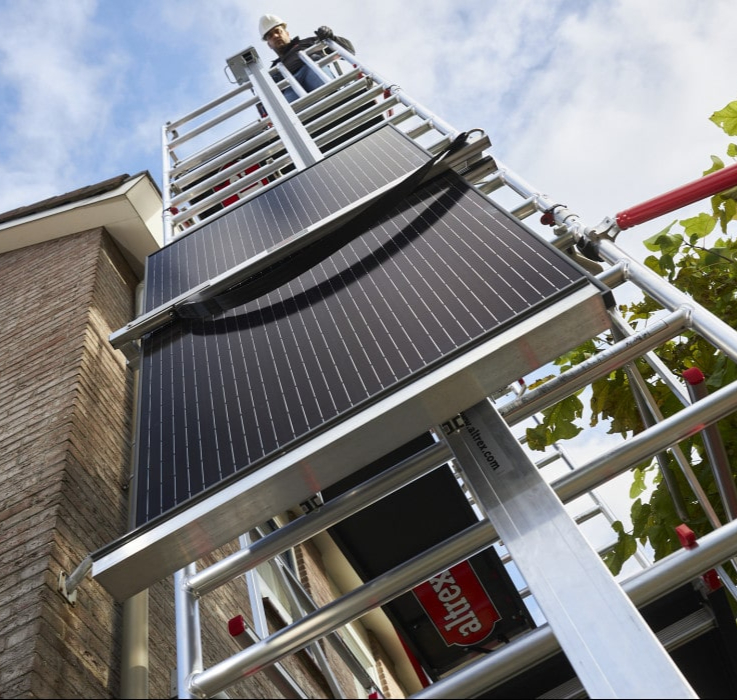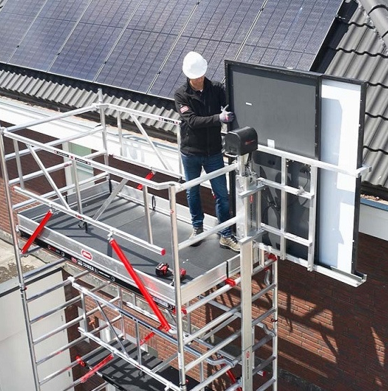 Echafaudage aluminium (roulant et fixe) double plateau avec option lève panneau photovoltaïque, lève caisse outils et console de déport.
